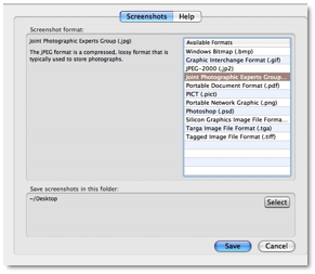 “Select the format, in the preference pane, in which you’ll most likely want screen shots captured. Screenshots Preference Pane also lets you change the default location to which screenshots are saved. Click the Select button and then navigate to your preferred folder.” (Since I’m working on reviews when I capture images, I use the default setting, which is my desktop.
