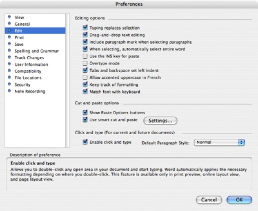 1. Choose Preferences from the Word menu. Word displays the Preferences dialog box. 2. Make sure the Edit tab is selected at the left side of the dialog box. 3. Make sure the Enable Click and Type check box is cleared. 4. Click on OK. |