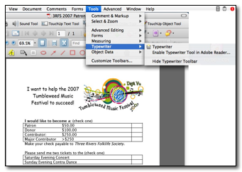 Note: To let Adobe Reader users type text in a PDF by using the Typewriter tool, open the PDF in Acrobat Professional, choose Tools > Typewriter > Enable Typewriter Tool In Adobe Reader, and save the PDF. See the image above.