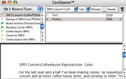 The program worked, more or less as I remembered. When you open a file with CanOpener it scans the contents for text and lists items in the contents area (the top right panel of the CanOpener window.) To display any item, double click it. You can select multiple items by holding down the Shift key and clicking the items. The selected items are displayed in turn with a brief pause between each.
