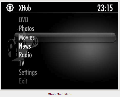 Feature-wise, Xhub has the most to offer North American TV viewers. In addition to the essential music, movies, and pictures, Xhub also offers internet radio, RSS feeds, and EyeTV integration. The default theme is very Front Row-like and is entirely customizable including hiding functions that you don't use. In my testing, Xhub offered all the file-format support one could hope for (Video_TS, DivX, Xvid in addition to QT supported formats) with the notable except of Matroska and flv (if you're looking for Matroska support, go ahead and skip down to MythTV). Xhub was built as a supplement to Salling Clicker, software that allows you to use a bluetooth cell phone or PDA as a high-end remote control. This gives Xhub some of the most sophisticated control options available on any system. The EyeTV integration is the closest thing to an integrated PVR we'll see outside of MythTV. It works pretty well, though the interface is a little clumsy to operate (you scroll through a big list of channels). Another nice touch in the newest version is a direct link to the full screen cover flow option in iTunes 7.1.