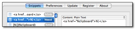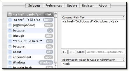 Mat Lu notes, “Oftentimes I want to paste a link into a forum post and I want to make it a hyperlink, not merely text. So all you need to do is add the following snippet to TextExpander, which I called "hlink" Now when you want to paste in a link, just copy the URL to the clipboard (e.g. from your browser), and type "hlink" and you'll get the hyperlinked URL.