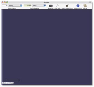 The interface of Meander is very clean and straightforward as well. As the following screen shot shows, you’re presented with a simple toolbar across the top, a sheet of clear-blue “acetate” which serves as your overlay on which you’ll plot your route, and a small scale “widget” that is used to help Meander accurately report the distances of points plotted on the map you’re working with. The scale at the bottom can be relocated and stretched to fit the scale of the map your acetate is floating over, and the Scale Distance drop down menu allows you to specify the distances in miles, kilometers, meters, feet, inches, centimeters and millimeters. Setting these properly before you start your plots ensures accurate measurements.