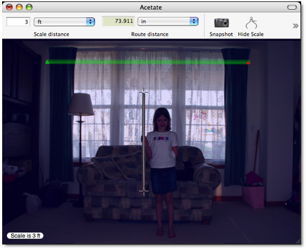 *After reviewing a final proof of the article (and measuring the windows seen in the picture for blinds this past weekend), I realized the measurement of 74 inches in this alternative use experiment is considerably off the mark. Of course this is because my daughter is standing approximately 3 - 4 feet in front of the window and not immediately alongside it. Because I still feel Meander could be used for approximating measurements outside of its intended uses, I decided to leave this part of the review intact rather than excise it for no other reason than to emphasize the program's flexibility. If you decide to use Meander for things other than maps, please take into account the basic geometry principles than I have, apparently, forgotten.