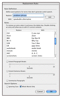Sometimes, and it really all depends on which voice your using, it just cannot handle the word phonetically. This is odd, because it’s not as if Cepstral Voices or Assistiveware, (the company that distributes the Acapela voices through InfoVox iVox program,) handle text differently. It all depends on the individual voice. For example, some voices from both companies can handle the word ‘iPod’ correctly, and some say it like it was saying the word ‘epod’. The beauty of iSpeak It is that you do not have to go and change the internal pronunciations of Mac OS X’s System Preferences. It has its own replacement structure and commands that work similar to a word processors ability to “find” and “replace” words. You simply input that whenever you see the word iPod, replace it with the term “I Pod”, or even “eye pod”, and it will then translate and speak the word correctly. Now this is a physical change, so it doesn’t help much if you also would like to print the dialogue out.